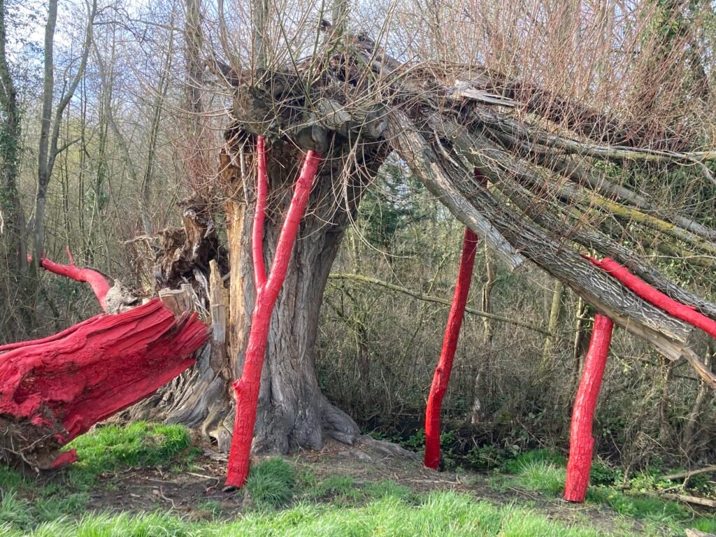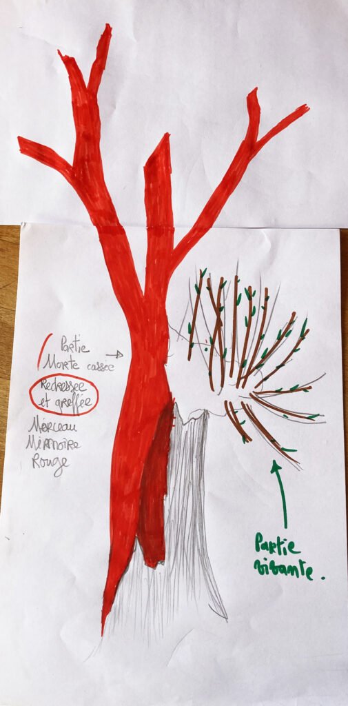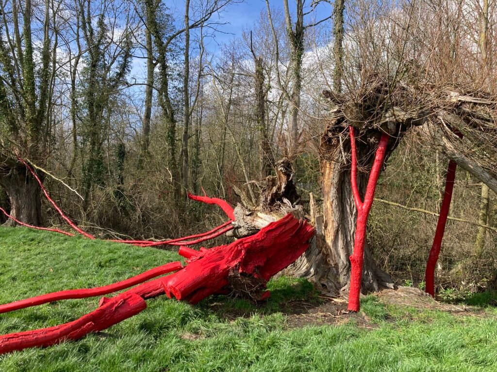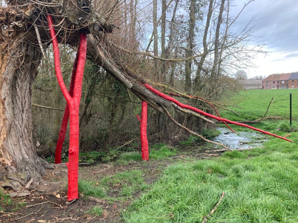Chaque bois mort ☠️ de cet arbre presque éteint 🌳 fût teinté de Ral 3002 , les éléments morts furent réemployés deviennent béquilles du propre sujet.